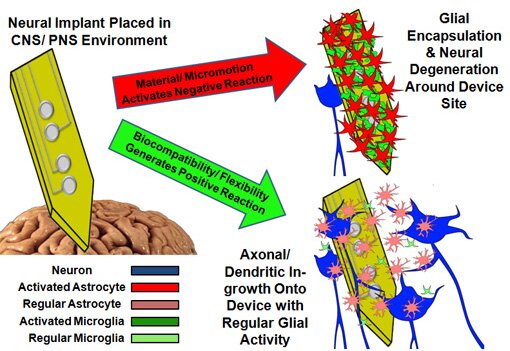 Apart from the surgery that is required to implant these interface devices, they eventually stop receiving signals in vivo after only a few years. As shown in the cartoon below, much of the device failure has been attributed to increased negative activity from the glia (support/ immune) cells as well as decreased axon/ dendritic activity and population of nearby neurons. The potential of BMI devices is limited currently due to the failure of the implantable neural interface.
